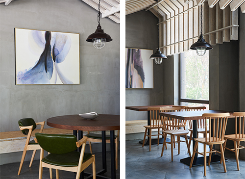 印象空間認為“空間本沒表情,通過軟裝搭配表達冷暖關(guān)系及空間情緒”。原本清峻的灰色空間,加入木質(zhì)家具,水彩掛畫,及彩色小擺件,瞬間提升餐廳的溫暖度,柔和冷硬的質(zhì)感。陽光透過玻璃,柔和的光澤滲透在空氣中,觸感都隨之柔暖起來。
