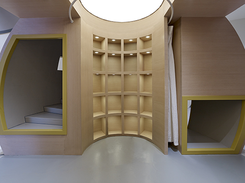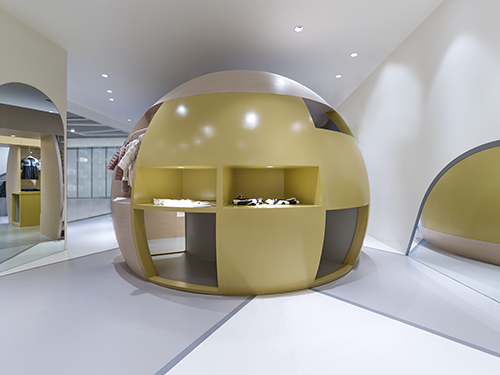 通過(guò)運(yùn)用一個(gè)欲破土而出的巨型“種子”,圓形設(shè)計(jì)憨態(tài)可掬,給人留下深刻的品牌形象,吸引成人與兒童一同走進(jìn)店內(nèi)探索其奧妙。形象鮮明的“種子”不僅在視覺(jué)上引人注目,功能上還融合了展示、銷售、儲(chǔ)藏等。不同人群的不同活動(dòng)模式,如挑選、試衣或者收銀等,被種子元素聯(lián)系起來(lái)。