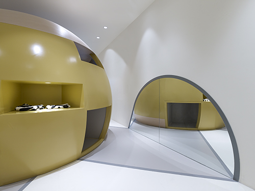 “借助種子的橢圓外形,以特定的規(guī)則和參數(shù)衍生出一圈圈圓環(huán),從種子的根基出發(fā),延展至地面及墻體——墻面上的圓環(huán)的演變成不同的功能,如鏡子、logo墻、品牌VI形象等。因而,整個(gè)店面,看似由單一的巨型圓形體塊主宰,而實(shí)際上卻隱含嚴(yán)謹(jǐn)?shù)倪壿嫿Y(jié)構(gòu)。種子并非獨(dú)立于店鋪存在,而是相輔相成。