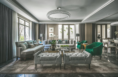 設(shè)計(jì)以玉石之王翡翠的色彩,應(yīng)用于灰色的主調(diào)空間,以豐富的家居配飾元素、鮮明的色彩層次及質(zhì)感的材料運(yùn)用,呈現(xiàn)了浪漫、靈動的空間之美,讓這個五層的別墅呈現(xiàn)了絕美風(fēng)華。