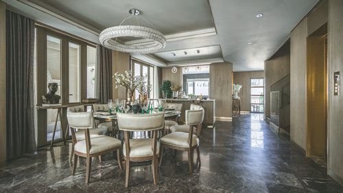 客廳與餐廳的設(shè)計(jì)中,高貴的氣質(zhì)在祖母綠與高級灰結(jié)合的剎那占領(lǐng)整個空間,在溫潤如玉的質(zhì)感與盈透的色澤中,彰顯著無與倫比的誘惑魅力。 她說:我想要讓身處其間的人,在妙曼的視覺感受之后,發(fā)現(xiàn)有某些元素能夠觸碰我們內(nèi)心的原點(diǎn)。配合著極簡的設(shè)計(jì)構(gòu)思,餐廳室內(nèi)空間設(shè)計(jì)在材質(zhì)的鋪陳和搭配上表達(dá)了現(xiàn)代設(shè)計(jì)的特質(zhì),祖母綠的餐具與精致的花藝點(diǎn)綴于餐桌上,使得空間層次分明。聚會廳的空間中,溫潤的黃翡色澤介入,材質(zhì)的混搭與精致的工藝形成一場精心的鋪排,簡潔有力的設(shè)計(jì)語言,抽象的藝術(shù)畫與精致雅趣的飾品在同一空間并置。在聚餐廳,你可見獨(dú)具風(fēng)情的鉚釘元素餐椅,來自歐洲的復(fù)古家具,宛若白流蘇一般的水晶吊燈,圖案獨(dú)特的地毯與精美的花藝,交疊出藝術(shù)的格調(diào)。