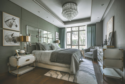 二層、三層為不同主人的臥室空間,均以營造靜謐為前提,用不同程度的灰色糅合現(xiàn)代風(fēng)尚,在內(nèi)斂與品質(zhì)之外,加入異域元素的融入。家庭廳在舒適和藝術(shù)之間達(dá)到共振,圓形沙發(fā)與白色皮質(zhì)單椅的圍合,讓家人相處的時(shí)間融洽自然,墻面掛飾稍作點(diǎn)綴,地毯仿佛一幅裝飾畫,大面積提升空間的裝飾感。主臥休息室主調(diào)為灰色,整體空間莊重內(nèi)斂,銅質(zhì)飾品的介入,形成一脈形成的藝術(shù)感。主臥的設(shè)計(jì)中,設(shè)計(jì)師將古舊粗獷的古羅馬建筑元素提煉成了床頭的藝術(shù)裝置,用精巧的方式將宏大的敘事載入空間,克制的色系與浪漫的表達(dá)形成了東方和西方的對話。次臥用不同程度的灰色糅合現(xiàn)代風(fēng)尚,特殊定制的亞克力床頭和邊柜,空間中的掛畫、飾品以簡潔的形式呈現(xiàn),極致的簡練和輕盈的浪漫并存。男孩房以精致的格紋與幾何線條的延伸界定了空間的格調(diào),歐洲建筑圖案為背景的單椅和精心布置的藝術(shù)品,讓空間更具情景化,純真浪漫。書房中,簡練的色調(diào),奔放的斑馬紋地毯與精致的皮藝形成視覺上的張力,凸顯經(jīng)典與現(xiàn)代的交織感。