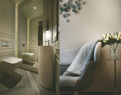 步入 B1 戶型,鋪上淺色木地板的客飯廳及開放式廚房立刻映入眼簾??蛷d的背景墻上掛起了波浪形的藝術(shù)裝置,配襯同色調(diào)的弧形布藝沙發(fā),模仿著水流動的形態(tài);而且仔細(xì)察裝置時,更會發(fā)現(xiàn)不同大小的同色調(diào)圓形墻雕呈不規(guī)則地排列,猶如小水點(diǎn)的簡約美態(tài),“水”的主題自然不言而喻。浴室中央則擺放設(shè)計(jì)精致的橢圓形獨(dú)立浴缸,加上簡約色調(diào)的淋浴設(shè)施,巧妙地凸顯以水為主題的設(shè)計(jì)構(gòu)思。