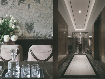 主要材料:進(jìn)口云石、意大利蜜蜂瓷磚、核桃木鋼琴漆、灰影木鋼琴漆、青古銅不銹鋼、皮革、壁紙