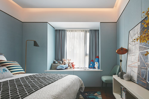很多時候,我們只需要一幅簡單有力量的掛畫來豐富空間內涵。好的設計,既是融合的又是獨立的。譬如,主臥的設計自成一格,中式韻味頗濃,但在細節(jié)處卻可以看到與客廳的呼應,明黃色的抱枕、金屬吊燈、綠植盆摘、單椅的造型都能再客廳覓得影子。兒童房則跳脫出風格的籬藩,賦予主題,故事,個性,喜好,是對于童年夢想的小小滿足。