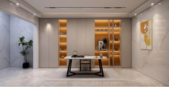 茶室的空間風(fēng)格極簡(jiǎn)化,大理石墻面、地板,演繹現(xiàn)代風(fēng),質(zhì)感溫潤(rùn),定制柜內(nèi)設(shè)暖色光線,觸動(dòng)視覺感光。CBD家居·黑金 | HG558餐桌,潤(rùn)白大理石桌面呼應(yīng)空間整體,幾何構(gòu)型的桌腳,堅(jiān)韌穩(wěn)固,延伸生活美學(xué)。