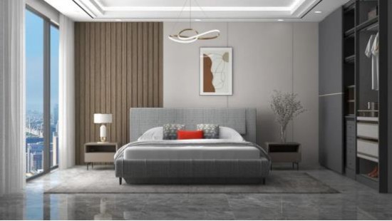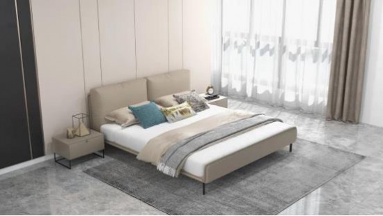臥室空間里,一張CBD家居·黑金 | HG002軟床,淺灰色奠定靜謐舒緩的睡眠氛圍,獨立大靠包飽滿軟彈,齊邊框加擋邊式床尾設(shè)計,節(jié)省空間,穩(wěn)固床墊,守護整夜安穩(wěn)好眠。