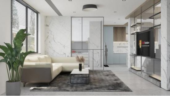 橫向考慮的話,設(shè)置落地窗能有效增強室內(nèi)采光,以及將客廳、餐廳、廚房打通成一體化空間,增強互動性,也強化了整體的空間感。另外整體空間里要避免實體隔斷,鏤空柜、玻璃都是不錯的選擇。