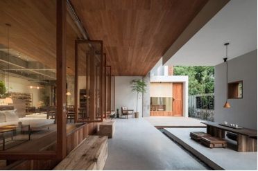 在南京展廳的呈現(xiàn)方式上,金鑫的設(shè)計打破了建筑的邊界,將室外空間與室內(nèi)空間交融互通,運用美國櫻桃木將其結(jié)構(gòu)劃分出為不同的“盒子”,讓整個展廳沐浴在陽光與自然之中。臥室、書房、餐廳、茶室,都變成一個個獨立的個體,環(huán)繞在共享大廳周圍。